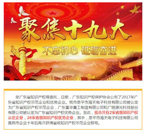 海天电子科技有限公司被评为广东省知识产权示范企业 资讯—— --摘自“江门科技”