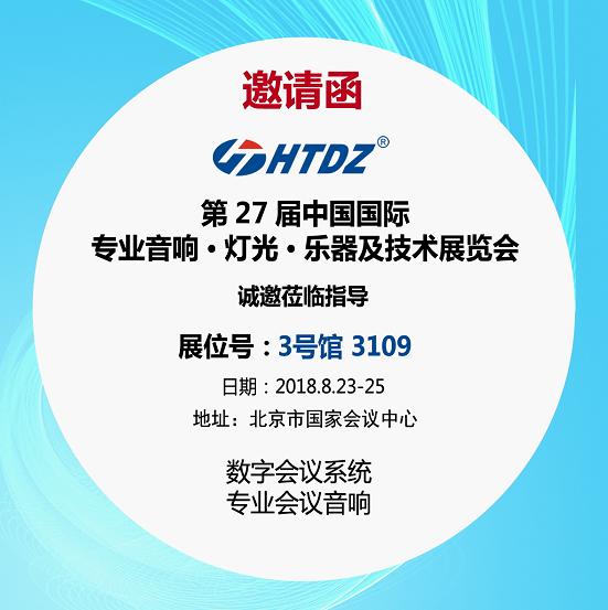 HTDZ诚邀您莅临PALM EXPO2018 8月23日至25日,第二十七届PALM中国国际专业音响·灯光·乐器及技术展览会将亮相北京·国家会议中心。PALMEXPO历经二十八载精心培育与反复锻造,其“高端、精品、专业”的内涵深入人心